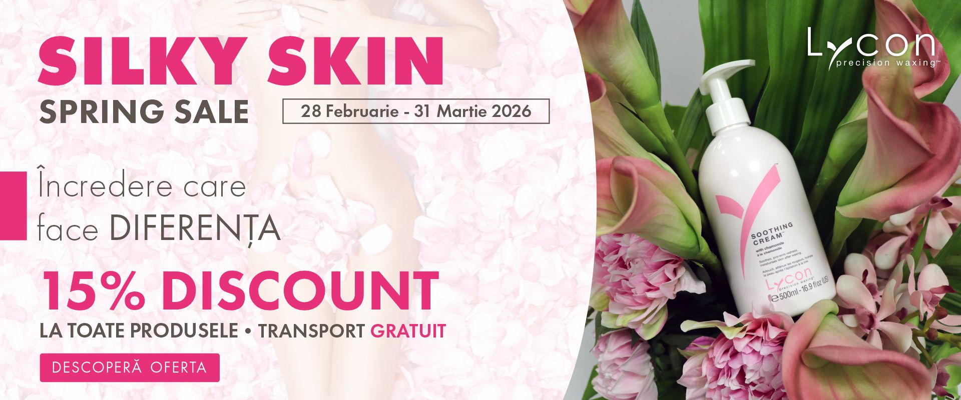 Silky Skin – Spring Sale 2026 îți oferă -15% DISCOUNT la toate produsele profesionale pentru epilare și îngrijire post-epilare, plus transport gratuit. Obține o piele fină, netedă și confortabilă cu formule premium recunoscute internațional. Ofertă valabilă 28 februarie – 31 martie 2026, exclusiv online.